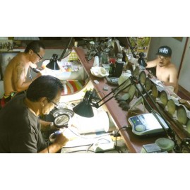 Chaque pièce est unique, découpée, polie et gravée à la main, dans les ateliers situés au fond de la vallée de Hamuta à Pirae sur l’île de Tahiti. Vous pourrez le constater visuellement sur les photos: si les formes des motifs sont semblables, chaque gravure est indivisible de l’inspiration de son créateur, de son style, et de la matière de la nacre, claire ou foncée, illuminée de ses reflets. Sur place, nous avons été impressionnés par la précision des gestes, l’extrême concentration des artisans créateurs, dans cette atmosphère de poussière nacrée aux senteurs marines.