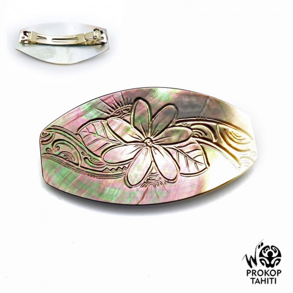 La Boutique du Monoï a sélectionné pour vous cette barrette polynésienne pour les cheveux en nacre gravée entièrement fabriquée à Tahiti.