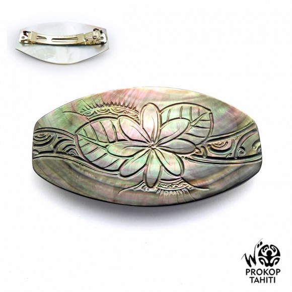 La Boutique du Monoï a sélectionné pour vous cette barrette polynésienne pour les cheveux en nacre gravée entièrement fabriquée à Tahiti.