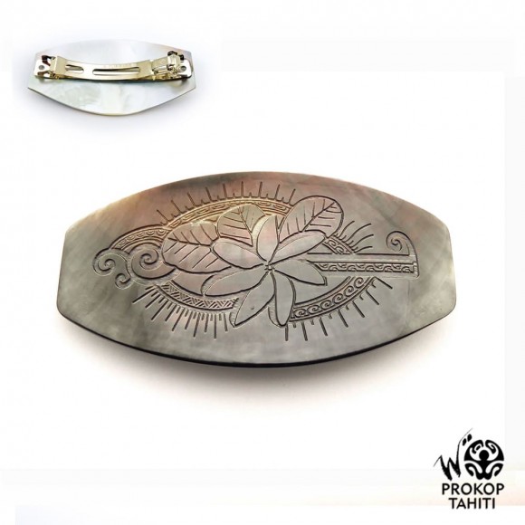 La Boutique du Monoï a sélectionné pour vous cette barrette polynésienne pour les cheveux en nacre gravée entièrement fabriquée à Tahiti.