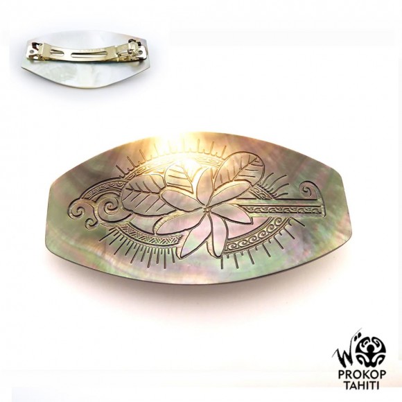 La Boutique du Monoï a sélectionné pour vous cette barrette polynésienne pour les cheveux en nacre gravée entièrement fabriquée à Tahiti.