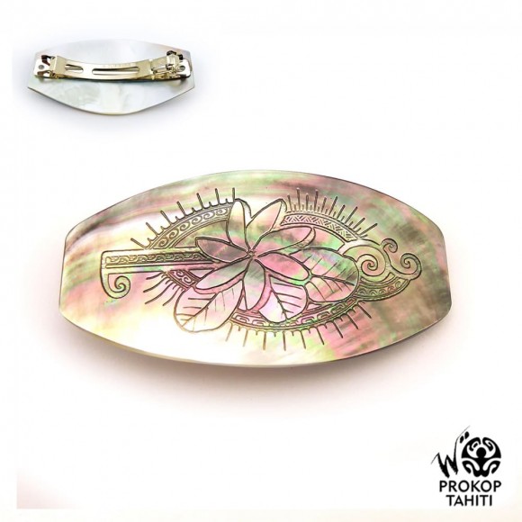 La Boutique du Monoï a sélectionné pour vous cette barrette polynésienne pour les cheveux en nacre gravée entièrement fabriquée à Tahiti.
