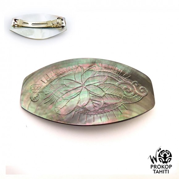 La Boutique du Monoï a sélectionné pour vous cette barrette polynésienne pour les cheveux en nacre gravée entièrement fabriquée à Tahiti.