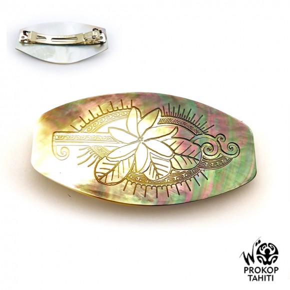 La Boutique du Monoï a sélectionné pour vous cette barrette polynésienne pour les cheveux en nacre gravée entièrement fabriquée à Tahiti.