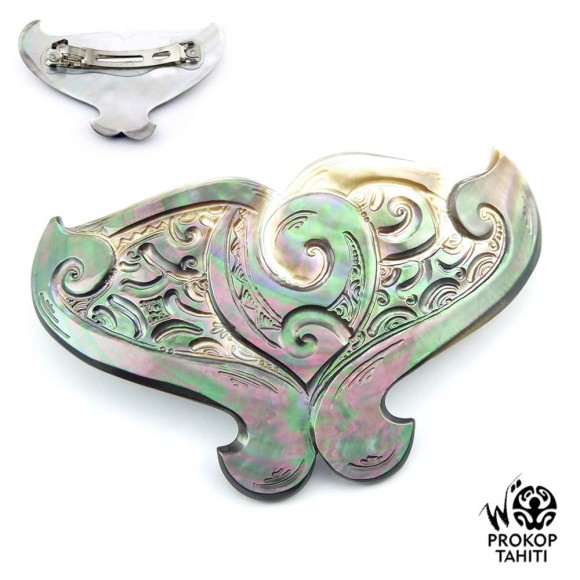 La Boutique du Monoï a sélectionné pour vous cette barrette polynésienne exceptionnelle pour cheveux en nacre sculptée XXL Collection Spéciale Prokop fabriquée à Tahiti.