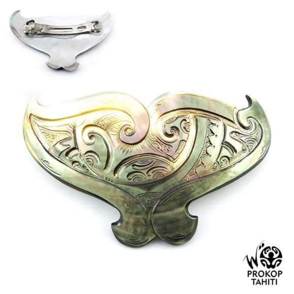 La Boutique du Monoï a sélectionné pour vous cette barrette polynésienne exceptionnelle pour cheveux en nacre sculptée XXL Collection Spéciale Prokop fabriquée à Tahiti.
