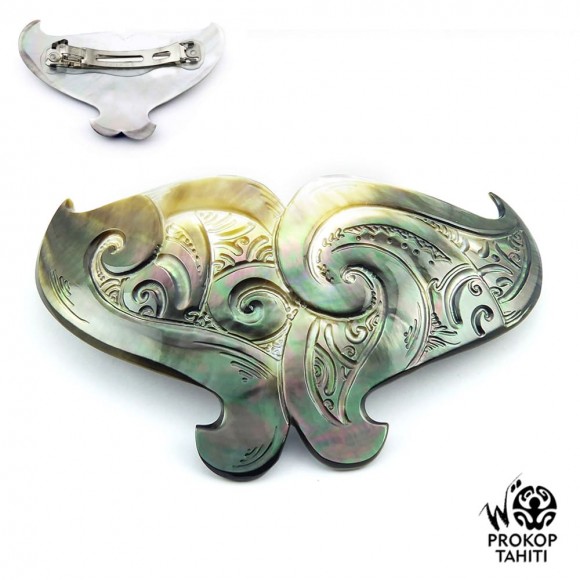 La Boutique du Monoï a sélectionné pour vous cette barrette polynésienne exceptionnelle pour cheveux en nacre sculptée XXL Collection Spéciale Prokop fabriquée à Tahiti.