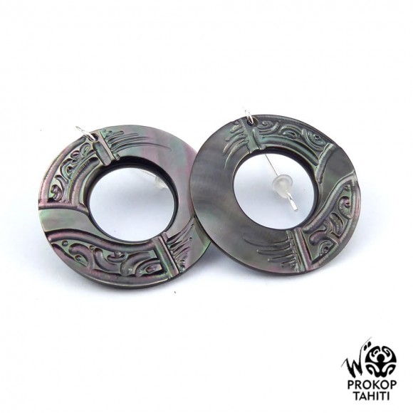 • Boucles d'Oreilles Rondes type Créoles en nacre gravée ton foncé (diamètre: 3 cm).