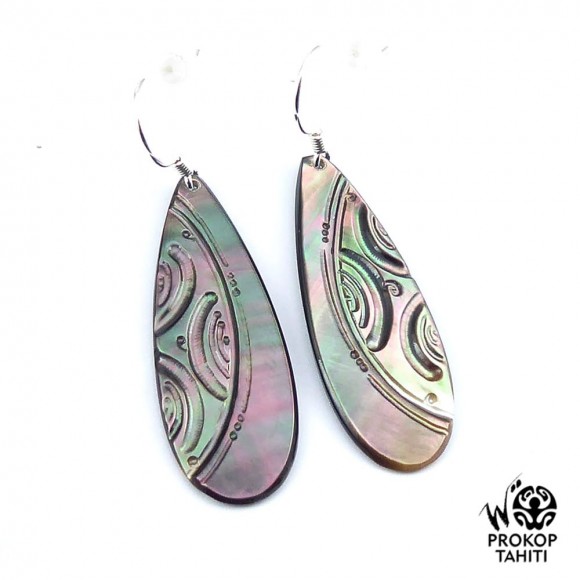 • Pièces en forme de mini goutte en nacre gravée ton foncé reflets verts et roses (1,5 x 4 cm). 2 Visages de Tiki protecteurs...