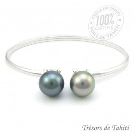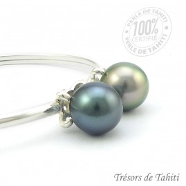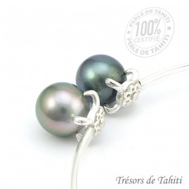 • 2 Perles de Tahiti Semi-Rondes : Couleur Gris clair reflets Peacock et Gris foncé reflets Bleu intense, avec chacune un beau lustre, et un diamètre identique de 10,50 mm. Qualité AA+ selon Gemmologica Institute of America. Une inclusion naturelle sur la perle claire.