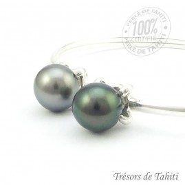 • 2 Perles de Tahiti Semi-Rondes : Couleur Gris Medium et Gris foncé reflets Vert intense, avec chacune un beau lustre, et un diamètre identique de 9,20 et 8,90 mm . Qualité AA+ selon Gemmologica Institute of America.