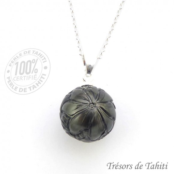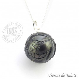 • Perle Gravée de Tahiti Semi-Ronde : Couleur Dark Vert, avec un beau lustre, et un diamètre de 13,20 mm.