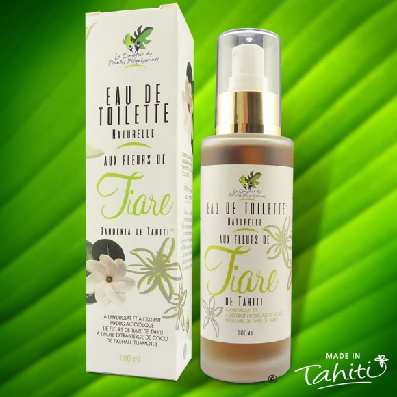• Cette Eau de Toilette délivre un parfum 100% naturel de Fleurs de Tiare Tahiti, issu d'un hydrolat et d'un extrait hydro-alcoolique de Fleurs de Tiare Tahiti. Sans additif de parfum synthétique.