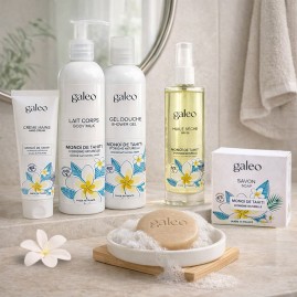 C’est une merveilleuse composition aromatique inédite, à la fois florale et ensoleillée que vous propose Galéo pour cette gamme au Monoï de Tahiti Appellation d’Origine. Dès les 1ères notes de tête, vous plongez dans l’univers du Monoï et de ses fleurs blanches de gardenia taitensis, la fleur de Tiare Tahiti, qui s’enrichissent au cœur des parfums du Muguet mêlés de notes de Mimosa et de Fleur d’Oranger. Des parfums exotiques de Noix de Coco et de Vanille viennent soutenir et prolonger ces notes florales délicates. La restitution de cette composition aromatique unique peut être plus ou moins prononcée en fonction du produit Galeo utilisé.