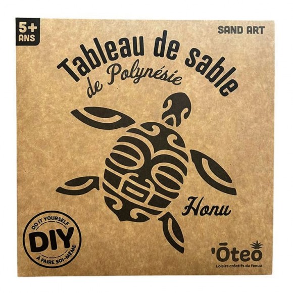 Ce kit contient le nécessaire pour réaliser et exposer un tableau de sable avec un motif polynésien. Dans une logique de réduction des déchets, l’emballage cartonné est conçu pour servir à la fois de mode d’emploi, de surface de travail et de présentoir une fois le tableau de sable terminé.