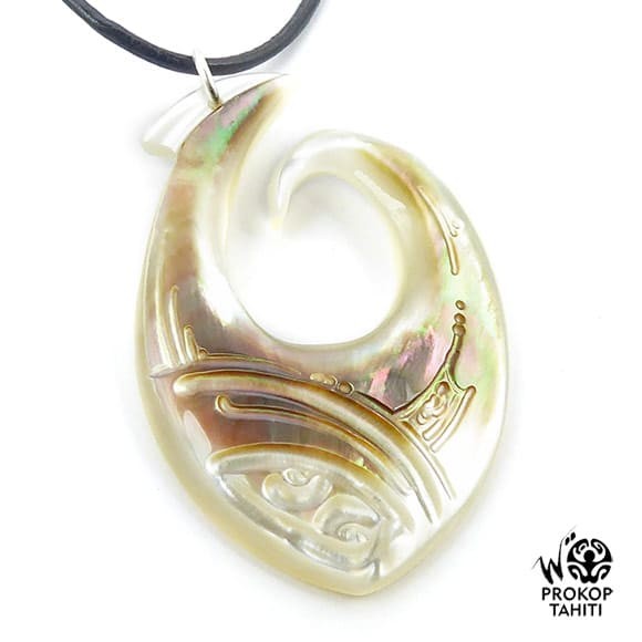 La Boutique du Monoï a sélectionné pour vous cet élégant pendentif en nacre gravée entièrement fabriqué à Tahiti par Woïta Prokop pour sa qualité remarquable.