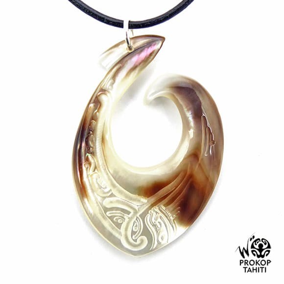 La Boutique du Monoï a sélectionné pour vous cet élégant pendentif en nacre gravée entièrement fabriqué à Tahiti par Woïta Prokop pour sa qualité remarquable.