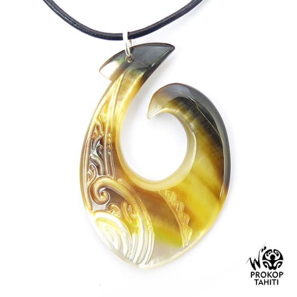 • Hameçon (Matau) en nacre gravée ton bicolore clair jaune Grand Modèle Massif XL (5 cm x 3 cm). Inclusion naturelle visible dans la nacre, raison de cette promotion.