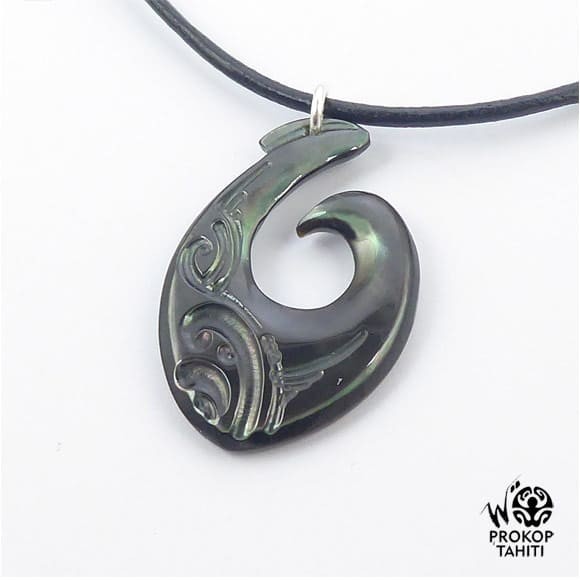 • Hameçon (Matau) en nacre gravée ton foncé reflets verts (1,8 cm x 3 cm).